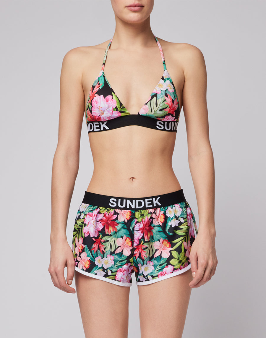 Give character to your look for summer 2023 with the women's short elastic-waisted beach shorts. In a Hawaiian pattern with contrasting jacquard elastic waistband, they are easy to match with your favourite swimwear to make every beach day perfect.