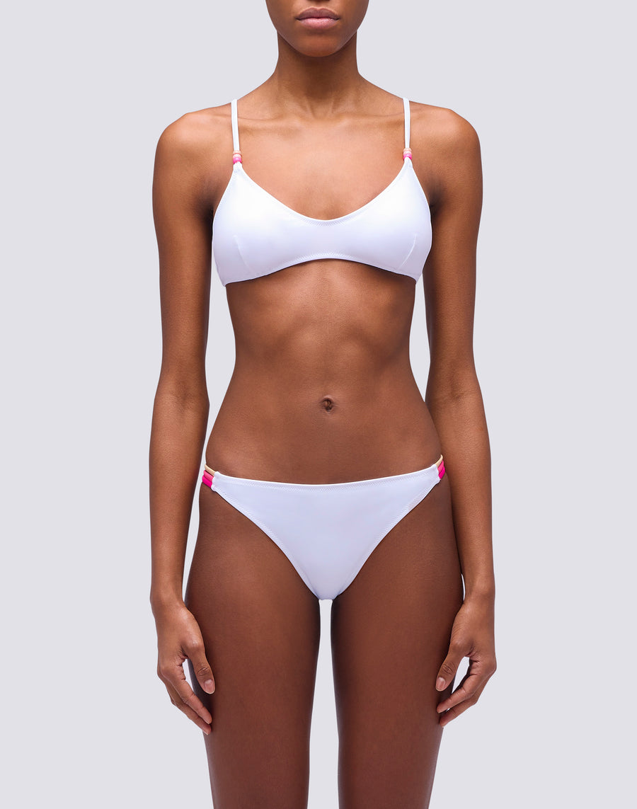 If you love trendy designs, you can count on this beach bikini consisting of a padded bralette top with multi-coloured beads and a Brazilian-style bottom with three-coloured bands at the hips.