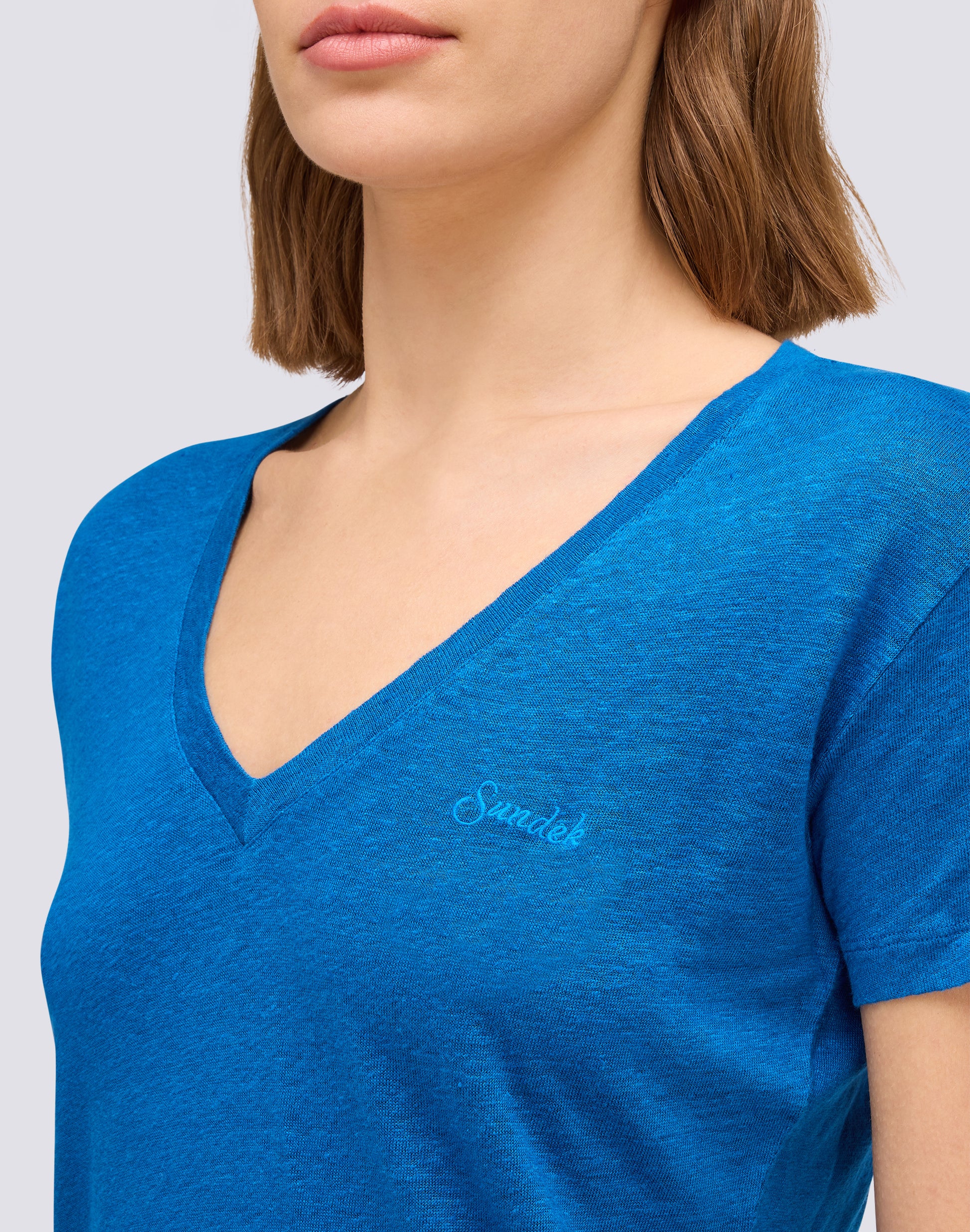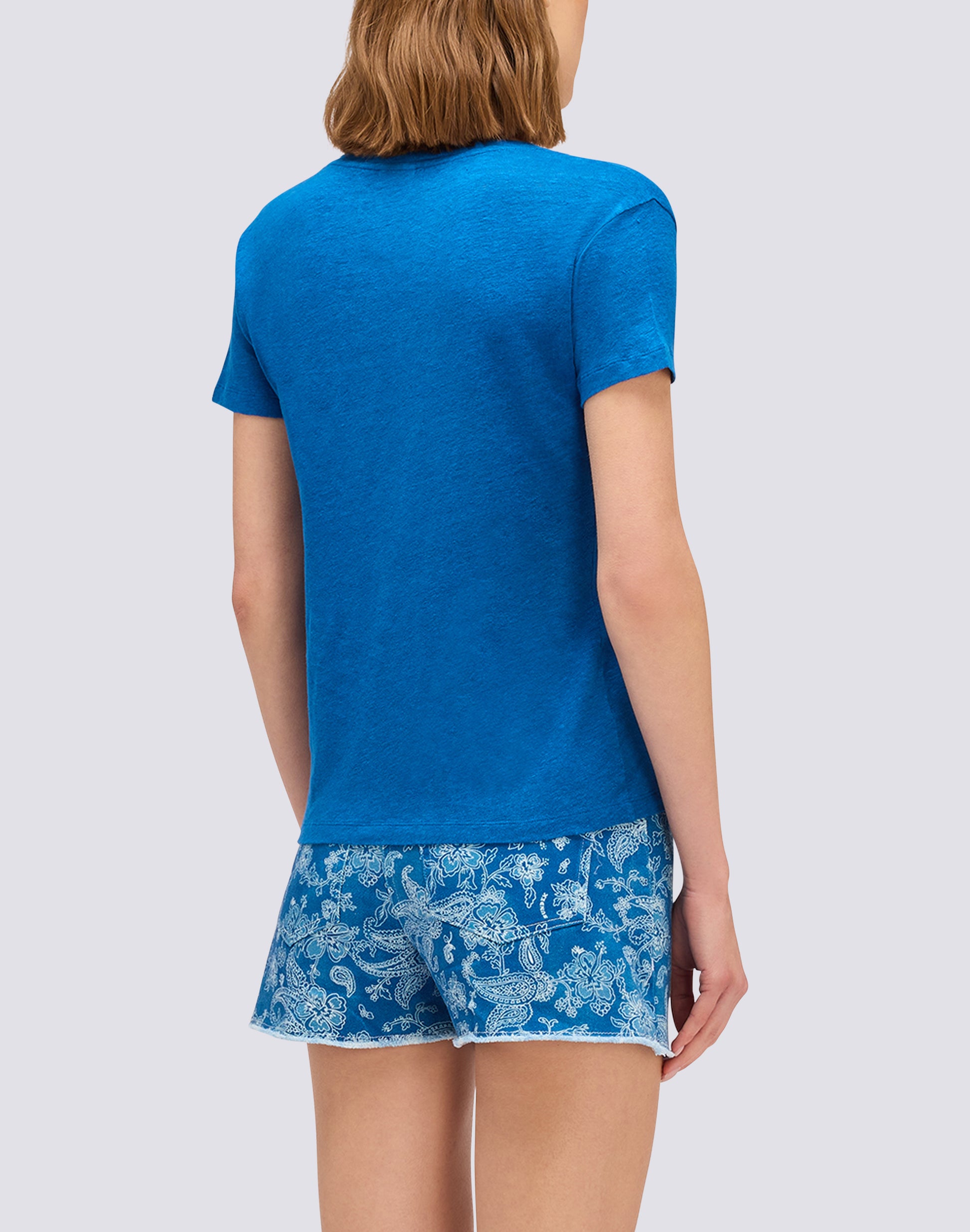 The short-sleeved linen T-shirt is ideal for summer: light, cool and comfortable. Made from high-quality linen fabric, this women's T-shirt is perfect for keeping you feeling cool and comfortable even on the hottest days. Available in a variety of colours, it is a must-have for your summer wardrobe.